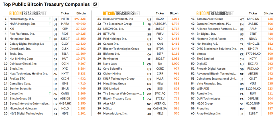 Namun, Strategy (sebelumnya MicroStrategy) tetap menjadi pemimpin tak terbantahkan dalam perlombaan Bitcoin perusahaan dengan 597.325 BTC di bawah manajemen. Mara Holdings mengikuti, memegang 49.940 koin.