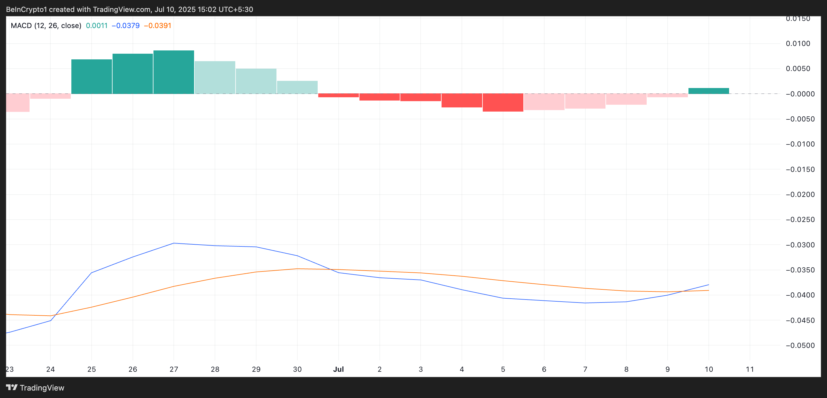 Kenaikan 4% PI telah memicu crossover bullish pada Moving Average Convergence Divergence (MACD) miliknya. Sebagai konteks, garis MACD token (biru) baru saja melintasi di atas garis sinyalnya (oranye) untuk pertama kalinya sejak 1 Juli, menandakan momentum bullish yang meningkat.