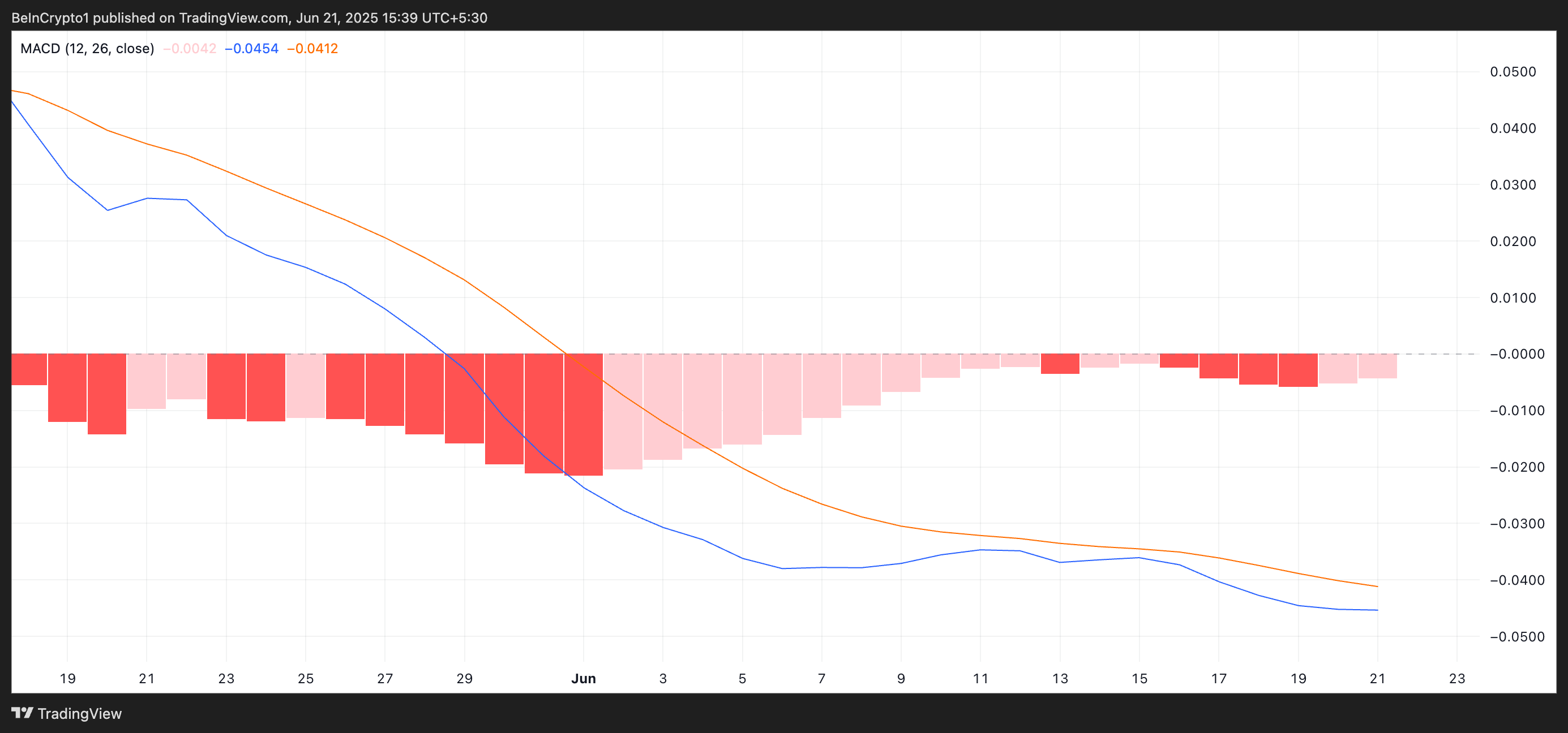 Pada grafik harian, indikator Moving Average Convergence Divergence (MACD) menampilkan momentum bearish yang makin tajam. Pada waktu publikasi, garis MACD PI (biru) berada di bawah garis sinyal (oranye).