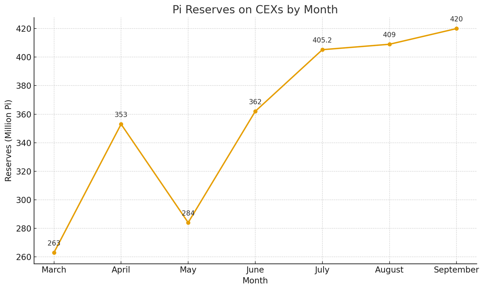 Tanda bahaya pertama adalah cadangan Pi di centralized exchanges (CEXs) mencapai rekor tertinggi, melampaui 420 juta PI, menurut data Piscan. Pada pertengahan Agustus, BeInCrypto melaporkan 409 juta PI di exchange, yang berarti lebih dari 11 juta PI telah ditransfer ke CEXs hanya dalam dua minggu.