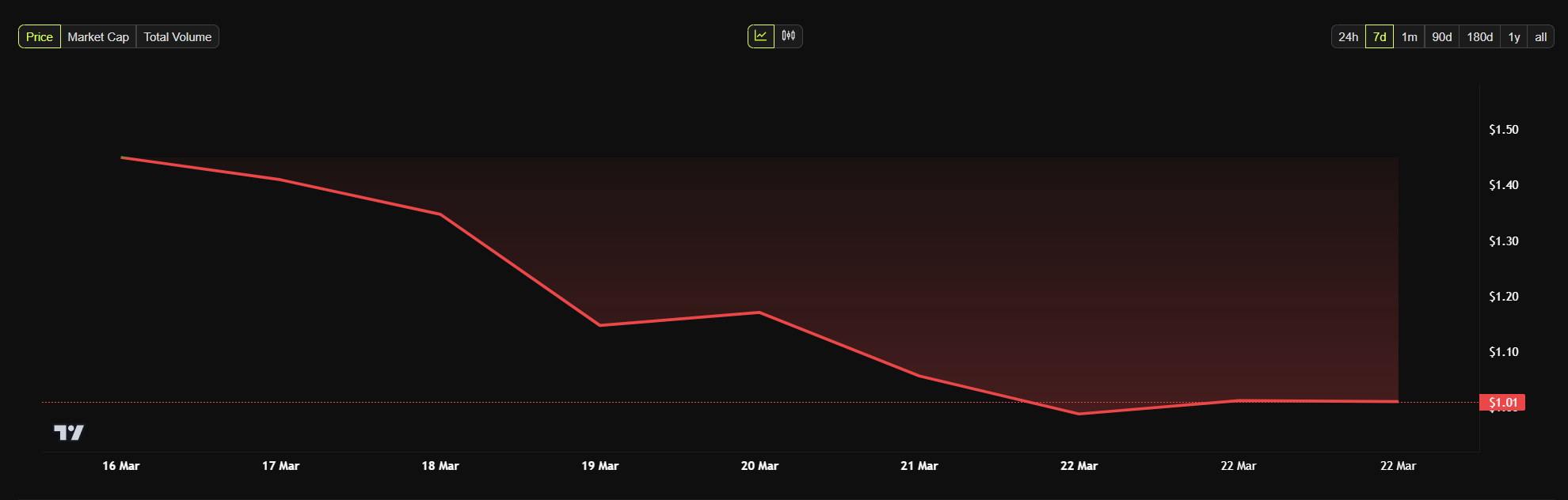 Sementara itu, harga Pi Coin tergelincir ke bawah level US$1 pada hari Sabtu (22/3), anjlok lebih dari 30% dalam kurun waktu sepekan terakhir.