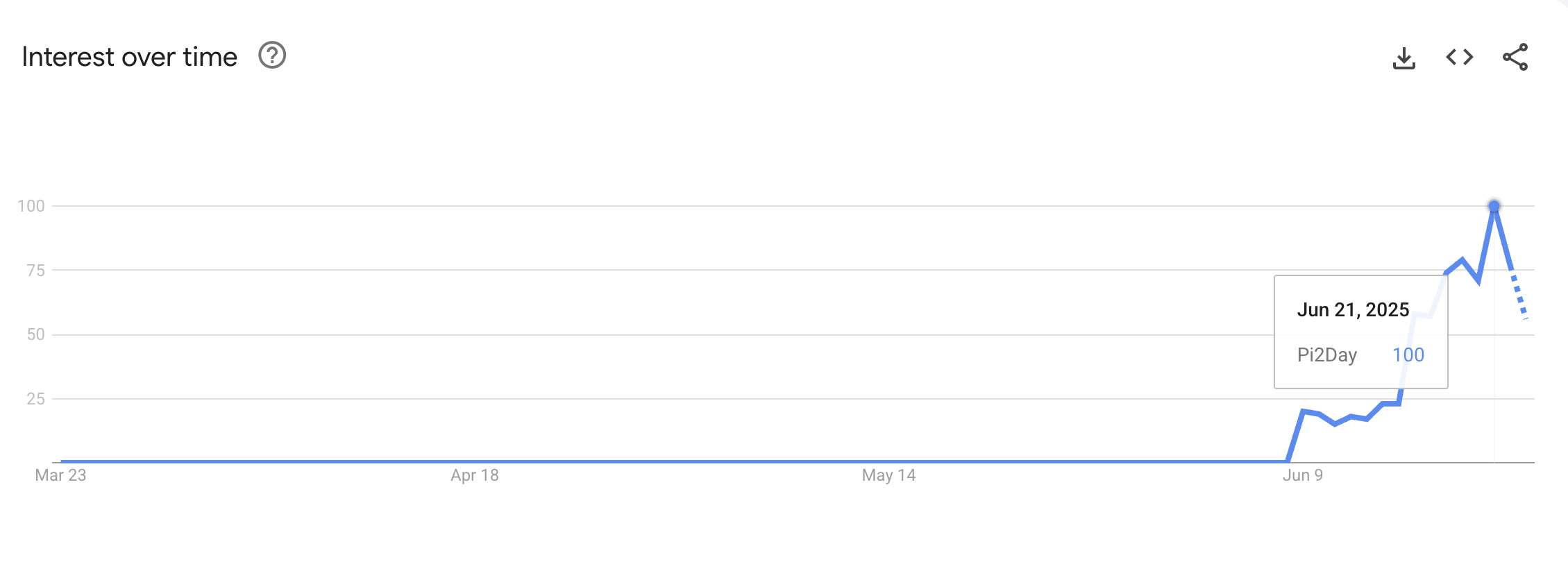 Data Google Trends menunjukkan bahwa minat pencarian untuk ‘Pi2Day’ mencapai puncaknya di angka 100 pada 21 Juni, menyoroti minat pengguna yang kuat. Lonjakan ini mendapat dorongan dari spekulasi tentang potensi pengumuman besar, termasuk listing di exchange dan peluncuran aplikasi baru.