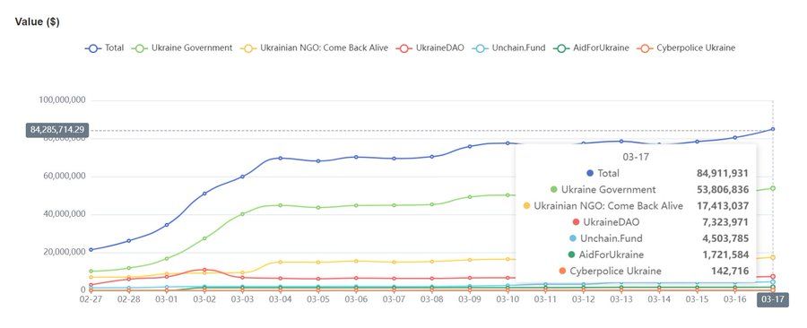 Berdasarkan pantauan SlowMist yang melacak aset kripto di blockchain hingga 17 Maret 2022 jam 3:25 UTC, total donasi dalam kripto untuk Pemerintah Ukraina sudah mencapai sekitar US$84,91 juta.