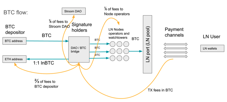 Sebagai gambaran, saat partisipan mengirim Bitcoin mereka ke Stroom, Bitcoin itu dikreditkan ke perbendaharaan Stroom DAO. Pada saat yang sama, jumlah lnBTC yang sesuai dikirim ke alamat Ethereum wallet partisipan.