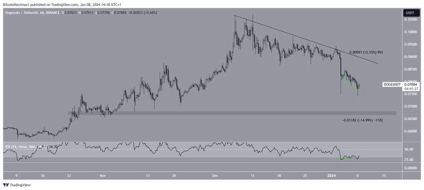 Jika pola double bottom dan bullish divergence ini terealisasi, harga DOGE berpotensi naik 13% dan mencapai garis tren descending resistance di US$0,089.
