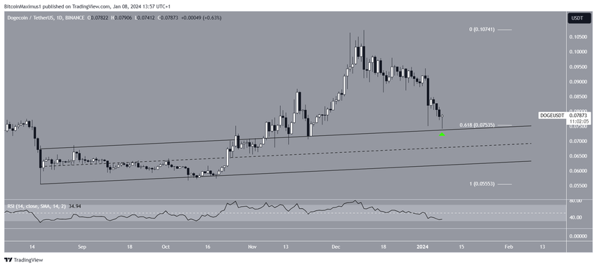 Namun, sejak saat itu, harga DOGE telah mengalami penurunan hingga mencapai level terendah US$0,074 kemarin. Adapun level terendah ini penting karena sebelumnya telah membentuk lower wick (ikon hijau), memvalidasi level support Fibonacci retracement 0,618 dan garis tren resistance dari ascending channel.