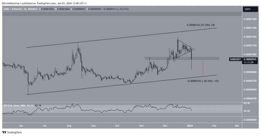 Adapun aksi harga menunjukkan bahwa harga SHIB telah diperdagangkan di dalam saluran ascending parallel sejak Juni 2023. Saluran seperti ini biasanya berisi pergerakan korektif. Terlebih, harga SHIB juga telah tergelincir dari pola segitiga simetris kemarin. Fenomena ini menjadi sinyal bearish yang bisa berarti tren naik telah usai.