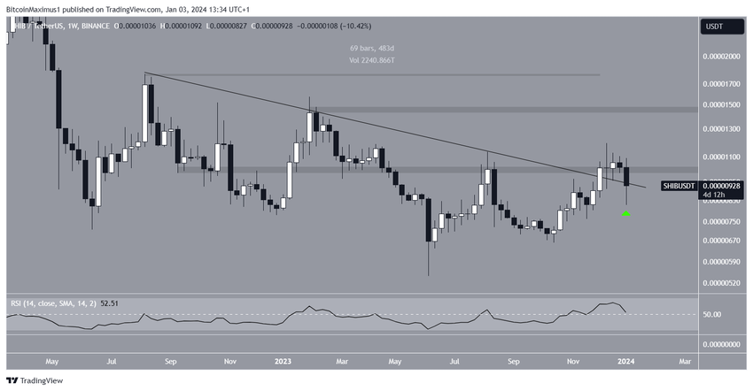 Aksi harga mingguan menunjukkan bahwa SHIB telah bergerak di dalam lintasan naik sejak menyentuh titik terendahnya di US$0,0000054 pada bulan Juni. Kemudian, pada bulan November, momentum naik ini mengantarkan SHIB pada terjadinya breakout dari garis tren descending resistance yang telah membatasi pergerakan harganya selama 480 hari. Baru setelah itu, SHIB mampu bergerak di atas area resistance horizontal.
