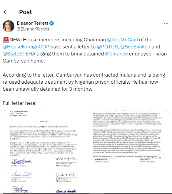 Konflik antara Binance dan pemerintah Nigeria saat ini semakin meluas. Setelah dua eksekutifnya ditahan dan menjalani persidangan atas beberapa tuduhan tindak pidana, beberapa politisi Amerika Serikat (AS) akhirnya mengajukan permohonan kepada Presiden AS, Joe Biden, untuk segera membawa kembali Tigran Gambaryan ke negara asalnya.