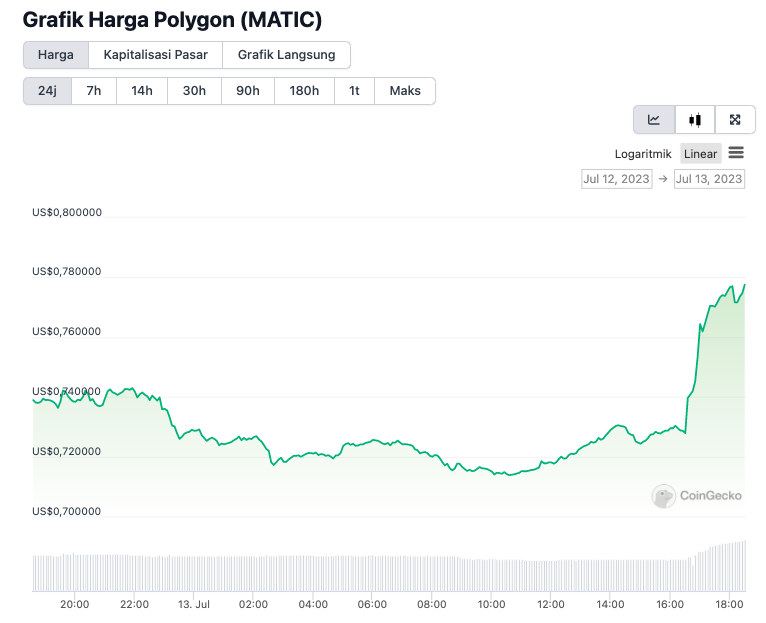 Terkait kabar ini, harga MATIC terpantau melonjak sejak pukul 16:30 WIB dan mengalami kenaikan 6,57% pada pukul 18:00 WIB. Berdasarkan data CoinGecko, harga MATIC naik sekitar 4,8% dalam 24 jam terakhir dan naik sekitar 11% dalam 7 hari terakhir.