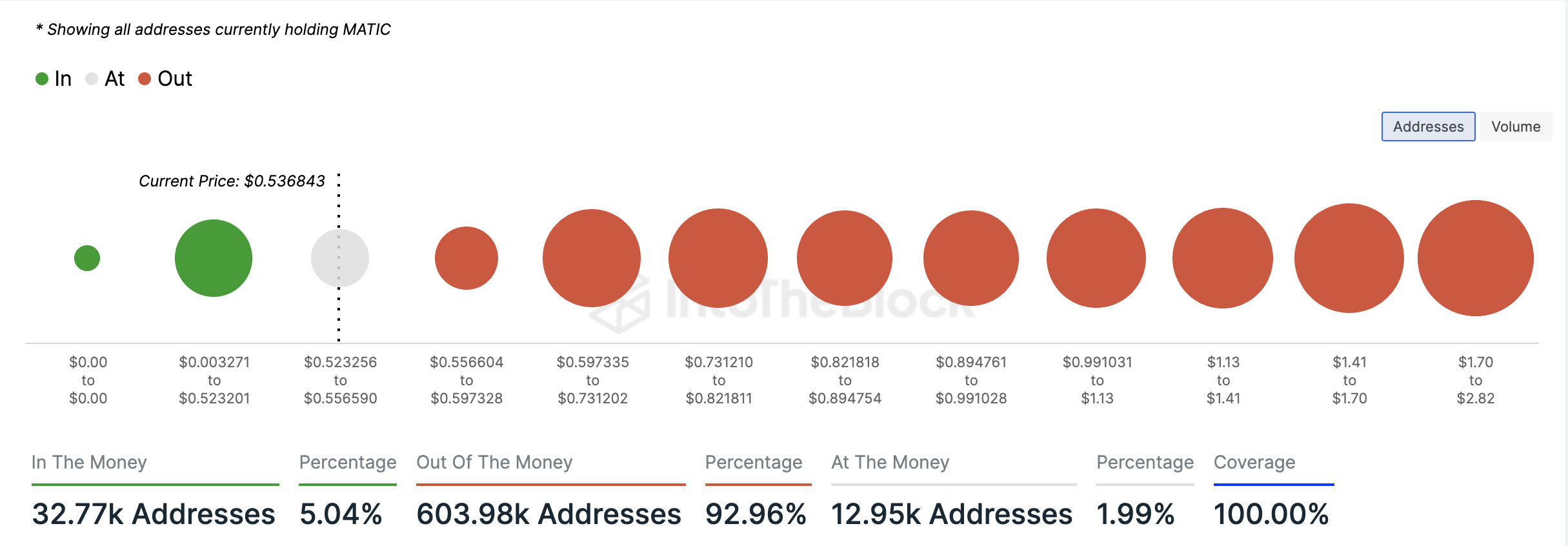 Suatu alamat dianggap “out of the money” jika harga pasar saat ini dari suatu aset lebih rendah daripada biaya rata-rata di mana alamat tersebut membeli (atau menerima) token yang saat ini dimilikinya.