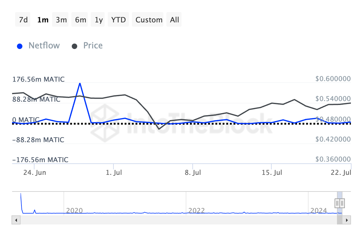 Saat ini, MATIC diperdagangkan seharga US$0,52. Nilai altcoin ini telah anjlok hampir 10% dalam sebulan terakhir. Dengan pemulihan harga jangka pendek yang sepertinya tidak mungkin terjadi, investor besar terus mengurangi kepemilikan mereka secara bertahap dalam altcoin ini selama 30 hari terakhir.