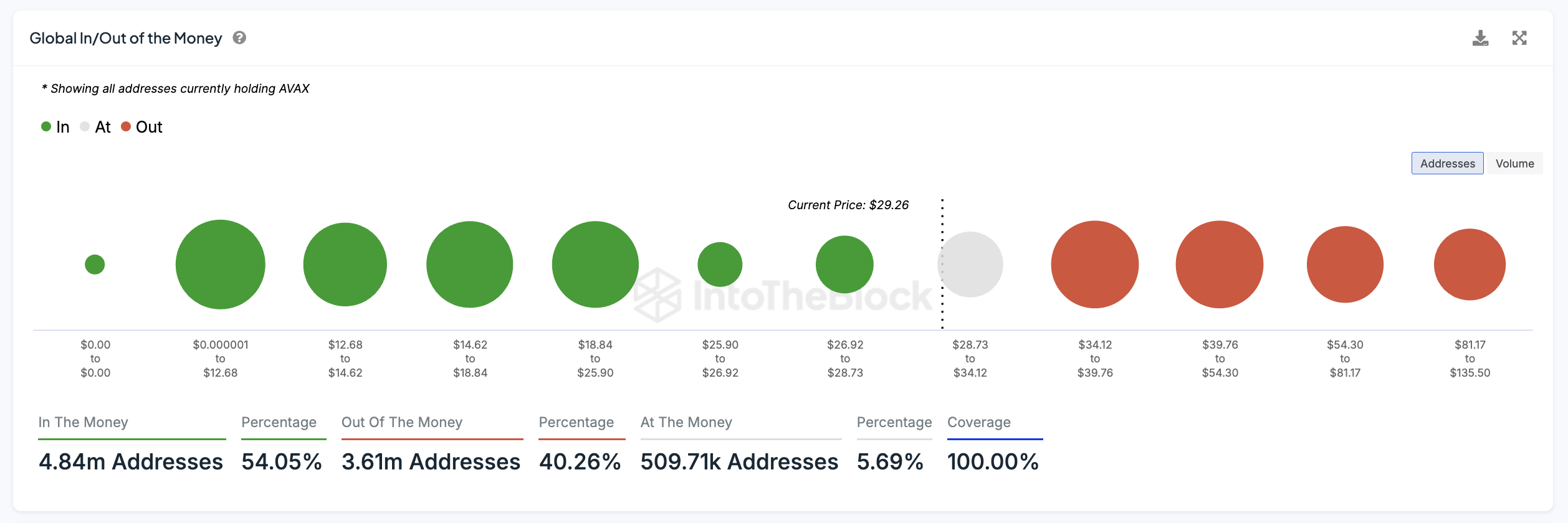 “Global In/Out of the Money” adalah metrik yang mengukur profitabilitas alamat yang memegang AVAX. Pada dasarnya, ini menunjukkan persentase alamat yang berada di “In the Money” (untung), “At the Money” (impas), atau “Out of the Money” (rugi) berdasarkan harga AVAX saat ini sebesar US$29,26.