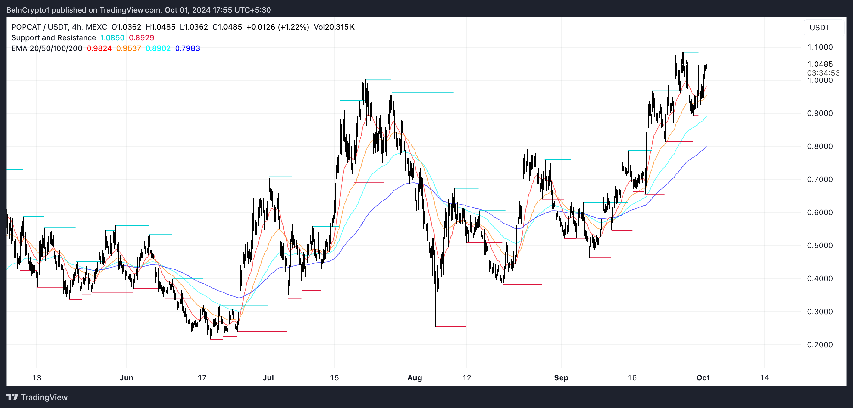 Walaupun celah antara garis-garis ini sedikit menyempit, jika tren naik terus berlanjut, POPCAT, sebagai salah satu meme coin terkemuka di ekosistem Solana, berpotensi menguji resistance di US$1,08. Jika resistance berhasil tertembus, harga bisa mencapai level US$1,10 atau lebih tinggi lagi. Ini akan serta-merta mencetak harga ATH anyar bagi POPCAT.