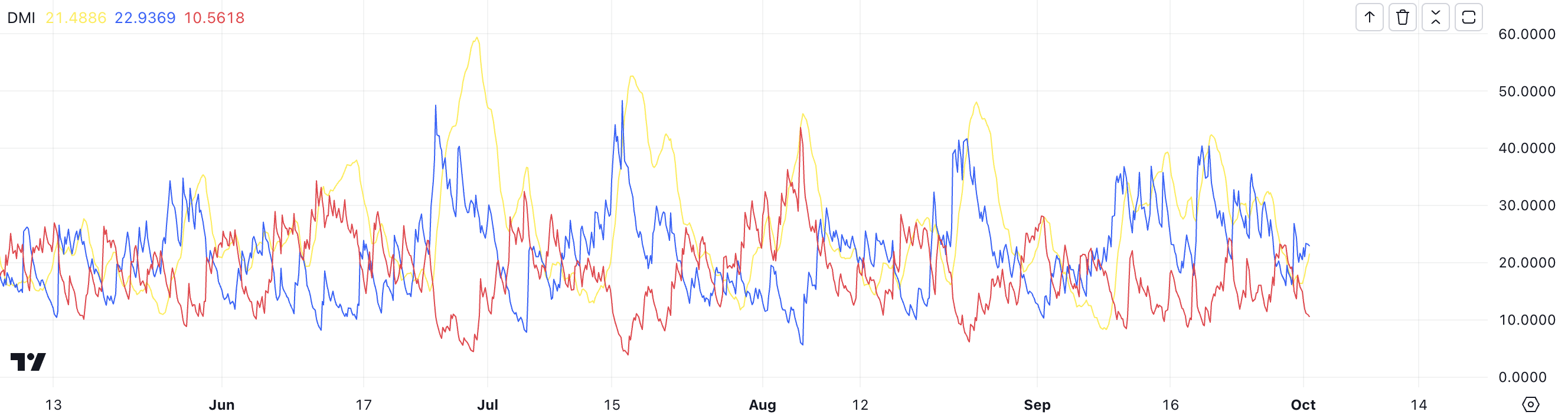 Indeks ADX berguna mengukur kekuatan tren. Kini angkanya berada di 21,49. Indikator Directional Movement Index (DMI) menjadi kunci dalam mengevaluasi arah dan kekuatan tren.