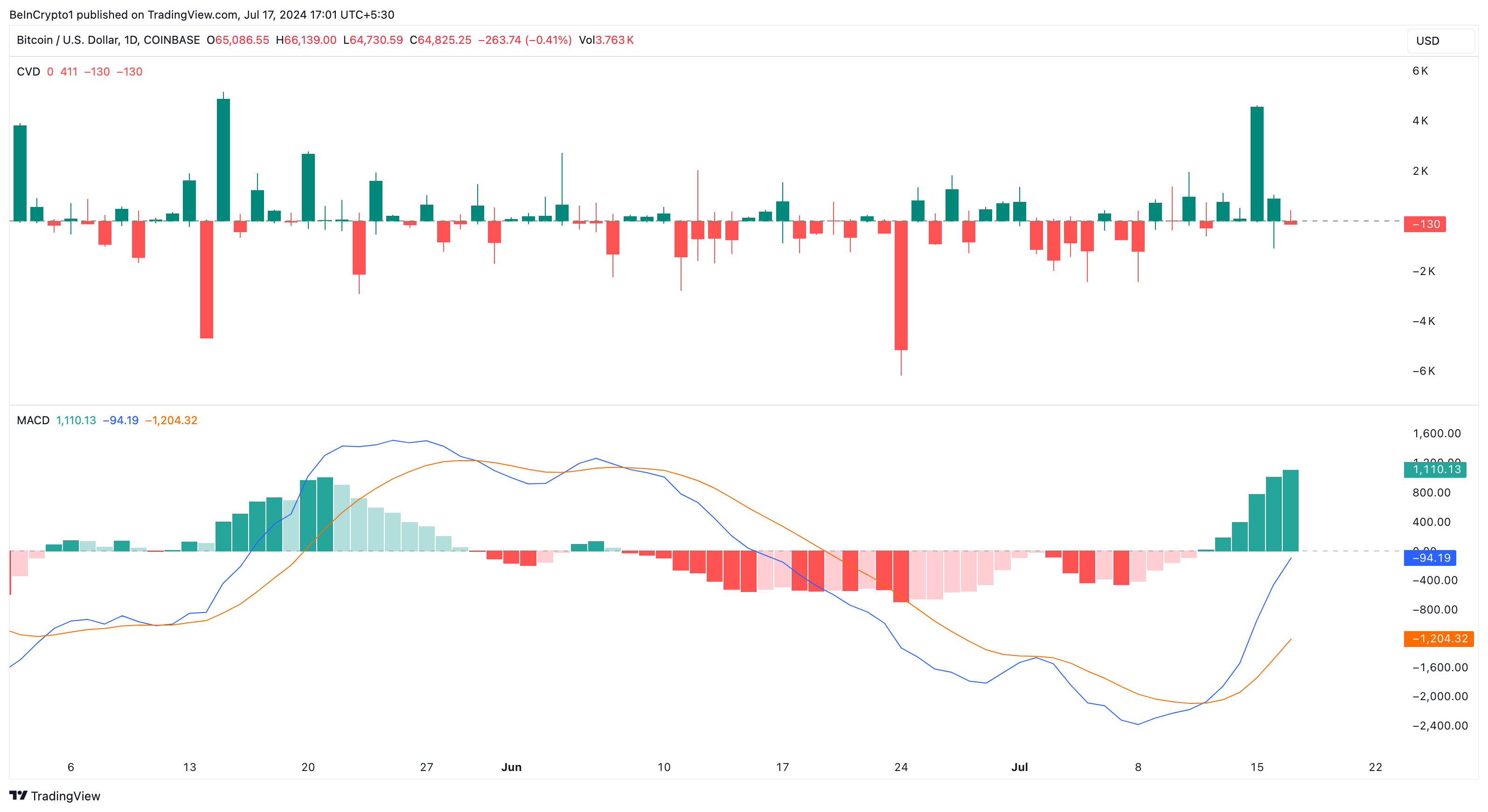 Oleh karena itu, nilai positif yang kini terpantau memberi tahu bahwa pelaku pasar telah memborong Bitcoin dengan volume substansial sejak 13 Juli. Hal ini juga ditegaskan kembali oleh Moving Average Convergence Divergence (MACD).