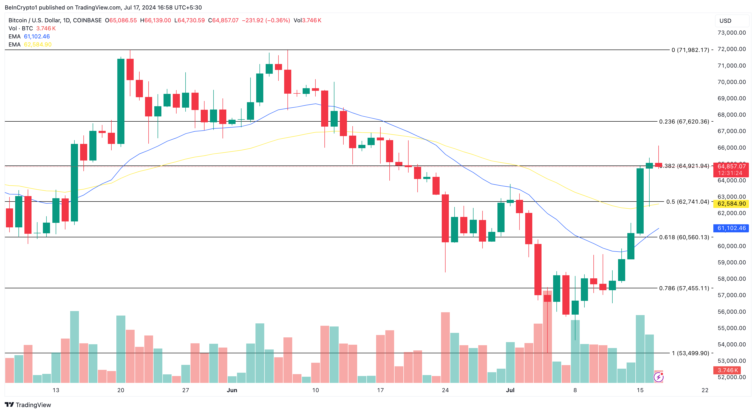 Menurut grafik harian, Bitcoin telah mengonfirmasi tren bullish setelah harga naik ke atas EMA 20 (biru) dan 50 (kuning).