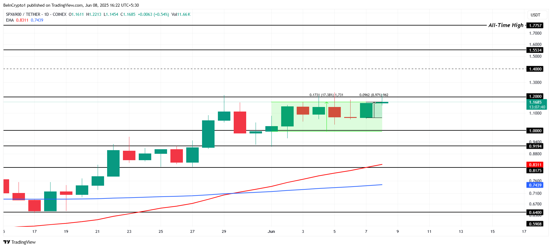 Harga SPX6900 telah naik 9% dalam 24 jam terakhir, menambah pertumbuhan 17% minggu ini. Meski demikian, meme coin ini terus berjuang di resistance US$1,20, level yang belum bisa ditembus selama beberapa hari.