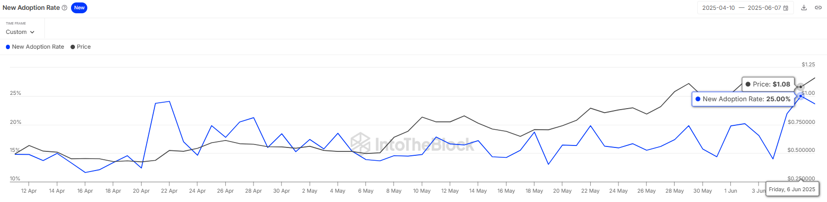 Tingkat adopsi untuk SPX6900 telah mencapai puncak dua bulan sebesar 25%. Tingkat adopsi ini merujuk pada persentase alamat baru yang melakukan transaksi pertama mereka relatif terhadap semua alamat aktif pada hari tertentu.