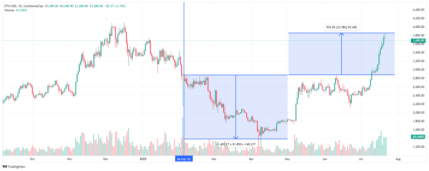 ETH mulai mengalami pemulihan pada bulan Mei. Kemudian, pada bulan Juli, harga ETH melonjak cukup agresif. Salah satu faktor pendorongnya yakni dukungan dari proyek kripto keluarga Trump, yaitu World Liberty Financial. Hingga kini, belum diketahui apakah Eric mengetahui rencana pembelian ETH oleh organisasi yang dekat dengan ayahnya tersebut.