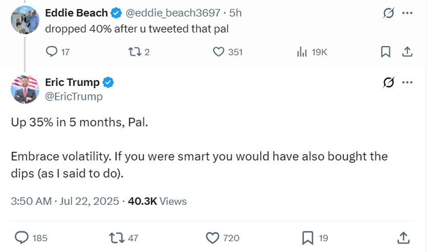 Di bawah unggahan tersebut, sesuai dugaan, berbagai komentar dari anggota komunitas kripto pun bermunculan. Banyak yang mengingatkan putra presiden itu akan anjloknya harga Ethereum tak lama setelah unggahan tersebut dipublikasikan. Menanggapi hal itu, Eric Trump berkilah bahwa harga kripto tersebut sudah kembali pulih dan bahkan mencatat pertumbuhan. Ia juga menekankan bahwa para pelaku pasar yang cermat tentu sudah memperhitungkan volatilitas tersebut dan memanfaatkan penurunan harga itu untuk menambah kepemilikan ETH mereka.