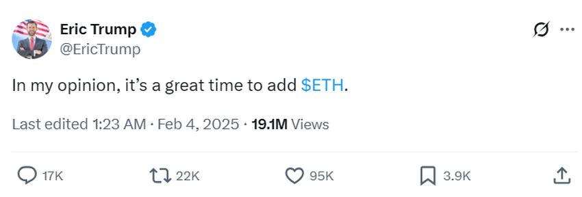 Pada 4 Februari 2025, Eric Trump mengunggah cuitan di platform X/Twitter. Ia menyatakan saat itu adalah momen yang tepat untuk membeli Ethereum (ETH).
