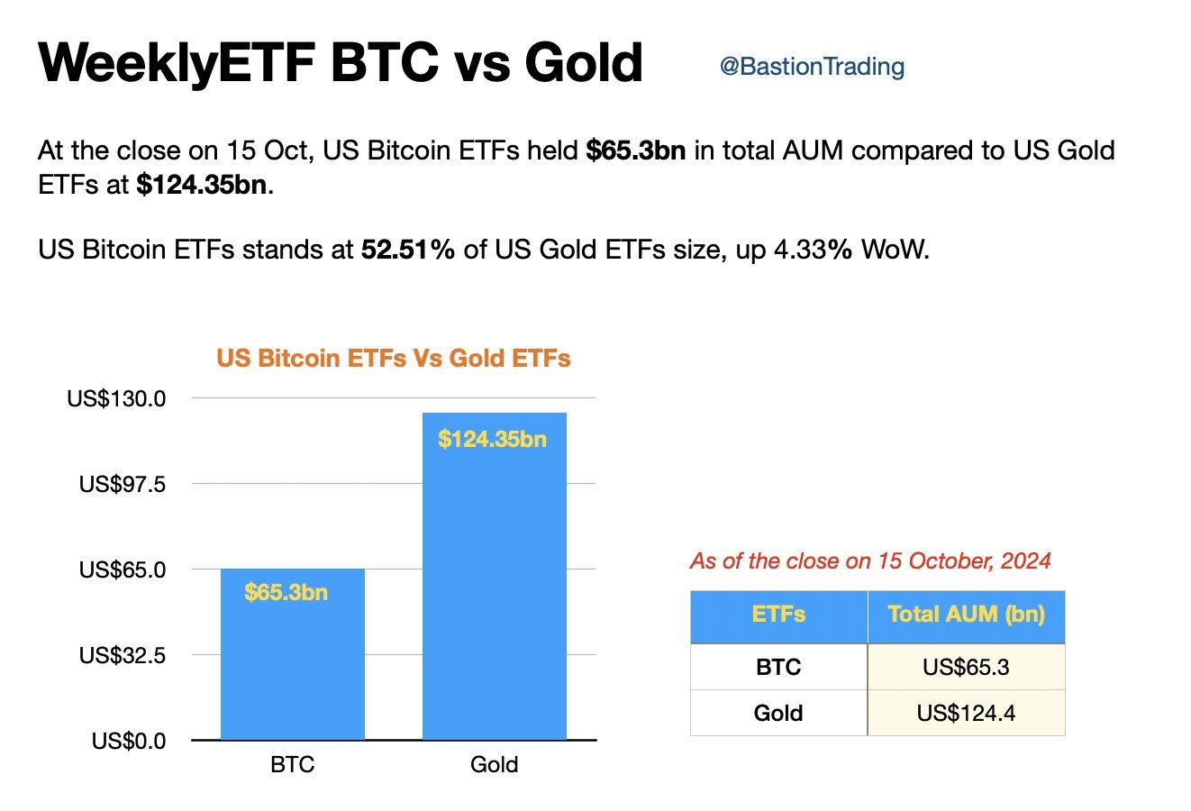 Data terbaru menunjukkan bahwa, meskipun kehadirannya masih kurang dari satu tahun, dana kelolaan (AUM) dari ETF Bitcoin lebih tinggi 52% dari ETF Emas.