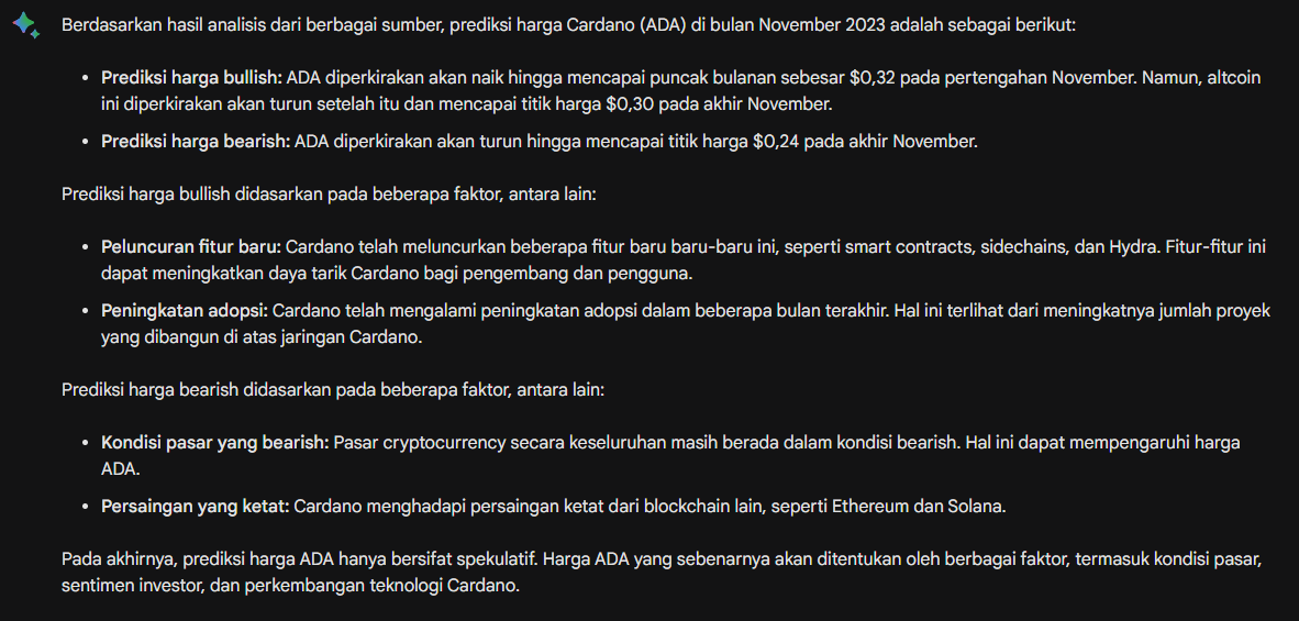 Chatbot AI Google Bard mencatat bahwa harga ADA untuk bulan November bisa tetap stabil di kisaran US$0,33. Pada saat yang sama, ia tidak menutup kemungkinan bahwa “harganya akan naik ke US$0,35 atau turun ke US$0,25, tergantung pada faktor-faktor pasar.”