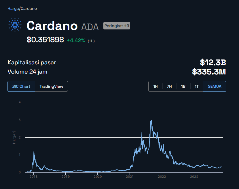 Kendati Cardano tengah mengalami reli bullish, harga ADA masih 89% di bawah rekor tertingginya sepanjang masa (ATH) sebesar US$3,09 yang tercatat pada September 2020. Token ADA saat ini berada di posisi nomor 9 dalam peringkat aset kripto, dengan kapitalisasi sebesar 11,36 ribu juta dolar.