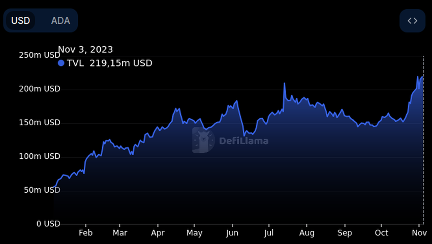 Tak berhenti sampai di situ, metrik yang tak kalah penting lainnya adalah bahwa menurut data dari DefiLlama, total value locked (TVL) Cardano di DeFi saat ini mencapai US$219,15 juta, yang menegaskan pencapaian tertinggi tahunannya.
