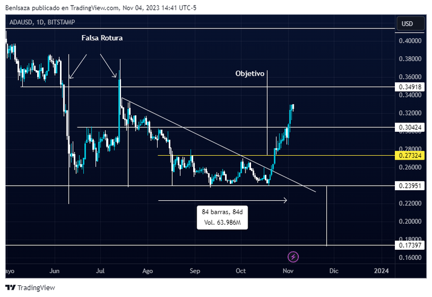 Selanjutnya, Benjamín Isaza, trader dan analis di BeInCrypto, menunjukkan bahwa, meskipun ADA telah breakout dari resistance US$0,30, penghalang utama dalam time frame harian berada di zona US$0,349.