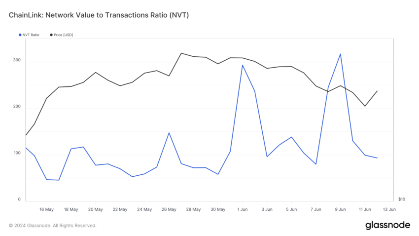Menurut data dari Glassnode, rasio NVT Chainlink telah turun menjadi 93,04. Biasanya, rasio NVT yang tinggi menyiratkan bahwa market cap melampaui pertumbuhan volume transaksi. Acapkali, ini maknanya jaringan sedang overvalued dan berimpit dengan harga premium token.