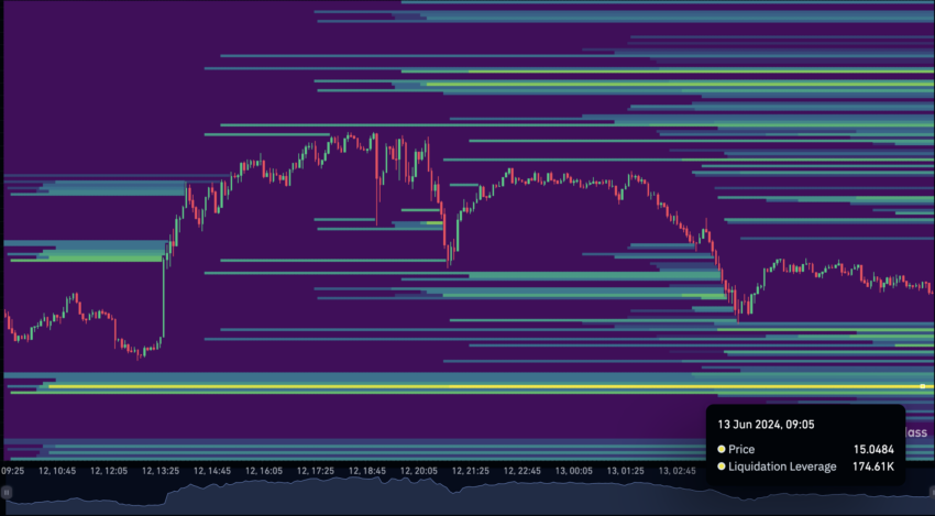 Menurut Coinglass, zona likuiditas magnetik ada di US$15,04, menunjukkan bahwa harga LINK berpotensi turun ke area ini andaikata tren naik tertolak.