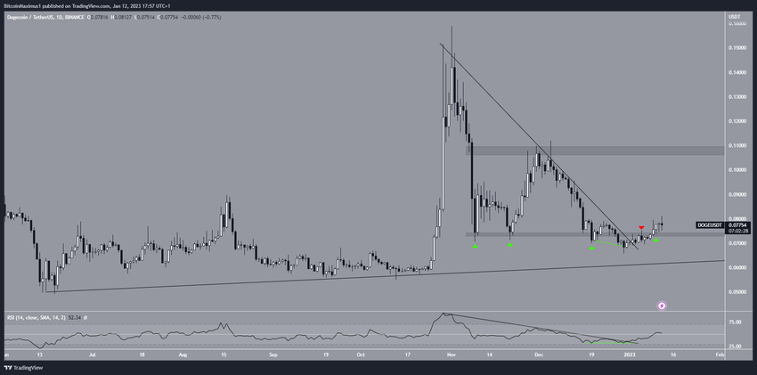 Maka dari itu, tren harga DOGE bakal dianggap bullish selama harga closing hariannya tidak menyentuh level di bawah area support US$0,074.
