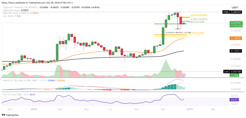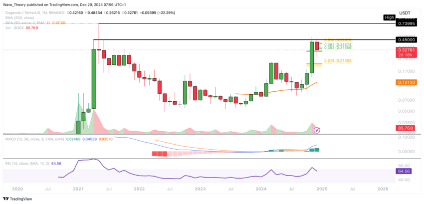 Jika Dogecoin menerobos support Fibonacci 0,382 secara bearish di kisaran US$0,316, maka level support Fibonacci signifikan berikutnya menanti harga DOGE di kisaran US$0,21 sebagai batas terakhir.