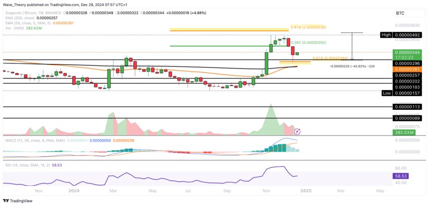 Terhadap Bitcoin, Dogecoin gagal mencapai golden ratio di kisaran 0,000055 BTC dan justru terkoreksi tajam.