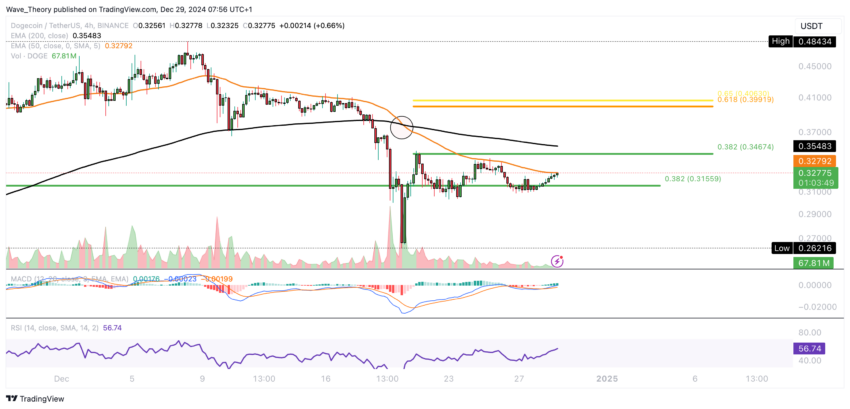 Saat ini, Dogecoin menghadapi resistance di 50-4H-EMA, yang berada di sekitar US$0,328. Baru-baru ini, DOGE mengalami penolakan bearish di level tersebut. Jika berhasil menembus resistance ini secara bullish, hal tersebut akan menjadi sinyal positif bagi pergerakan harga Dogecoin.