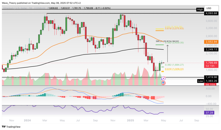 Di samping itu, EMA pada grafik mingguan telah membentuk golden crossover, yang mengonfirmasi tren bullish jangka menengah. Namun, Ethereum masih dalam fase koreksi yang hanya akan berakhir ketika ETH berhasil menembus “golden ratio“ di sekitar US$3.100.