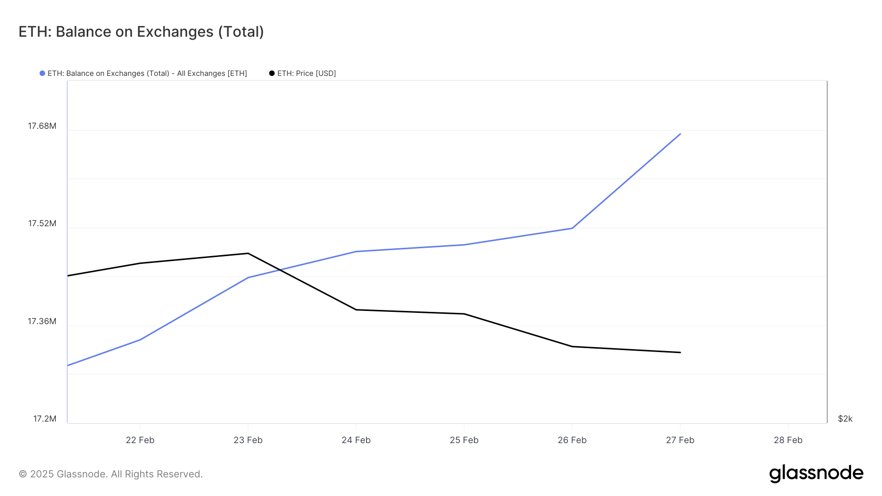 Di sisi lain, saldo ETH yang tersimpan di exchange juga terkerek naik, menambah kekhawatiran pasar. Setelah sempat terjun ke level terendah tahun ini di 17,27 juta ETH pada 21 Februari, angka tersebut kembali naik. Hingga saat ini, 17,67 juta ETH tersimpan di wallet exchange—menandai apresiasi 2% dalam sepekan terakhir.