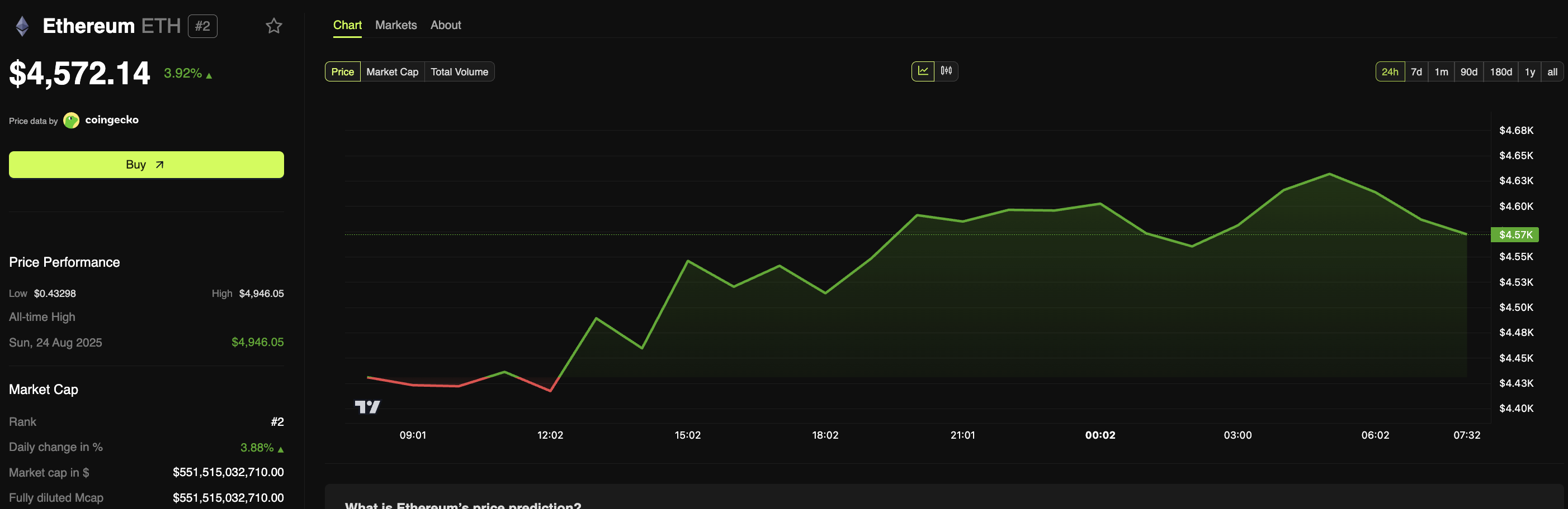Saat ini, ETH menunjukkan tanda-tanda koreksi setelah mencapai rekor tertinggi baru-baru ini. Pada saat penulisan, data menunjukkan ETH bergerak pada US$4.572,14, naik 3,92% dalam 24 jam terakhir.