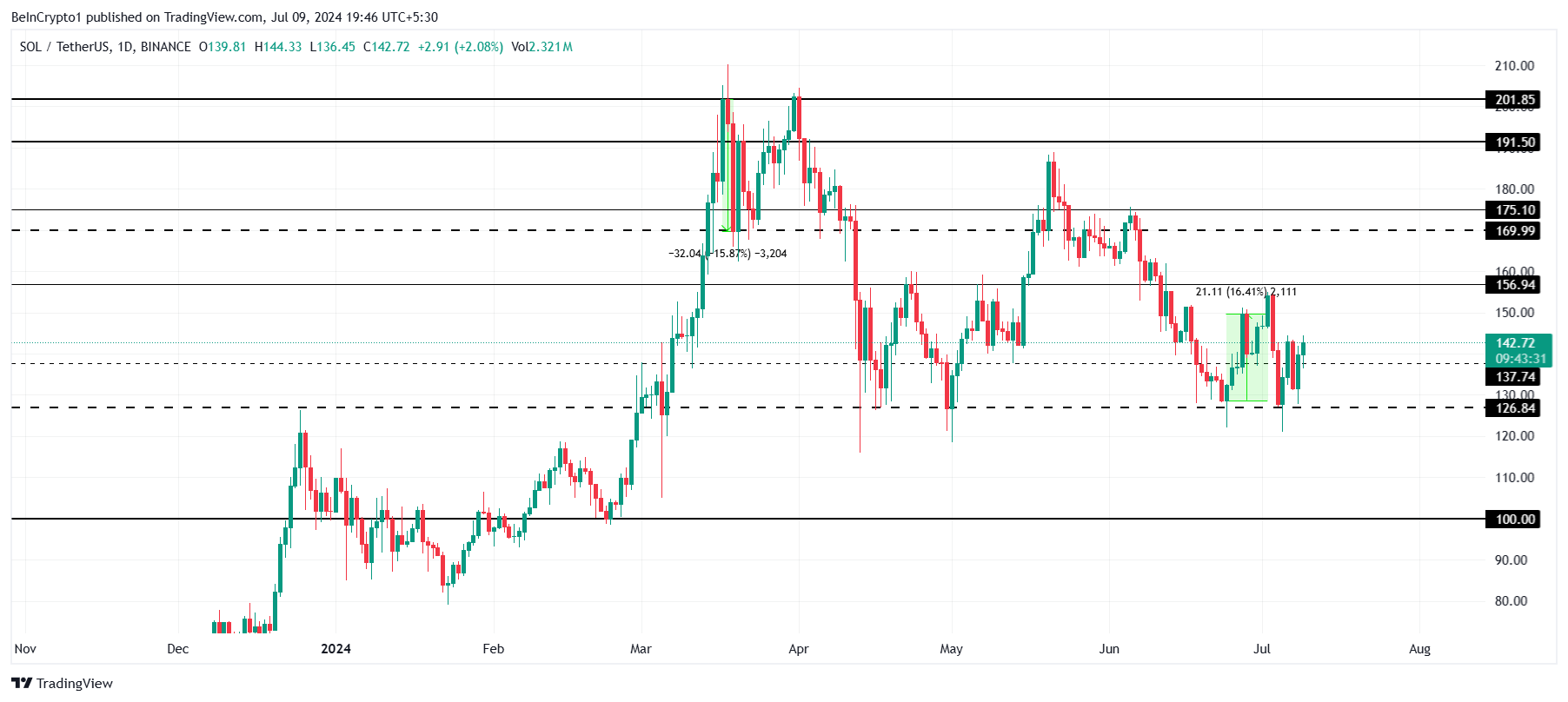 Harga Solana kini diperdagangkan di level US$142 pada saat publikasi. SOL sedang melancarkan aksi pemulihan dari US$126 usai mengujinya untuk ke-6 kalinya dalam lima bulan. Adapun rintangan berikutnya sekarang adalah menembus sekaligus mengubah area US$150 menjadi support floor.