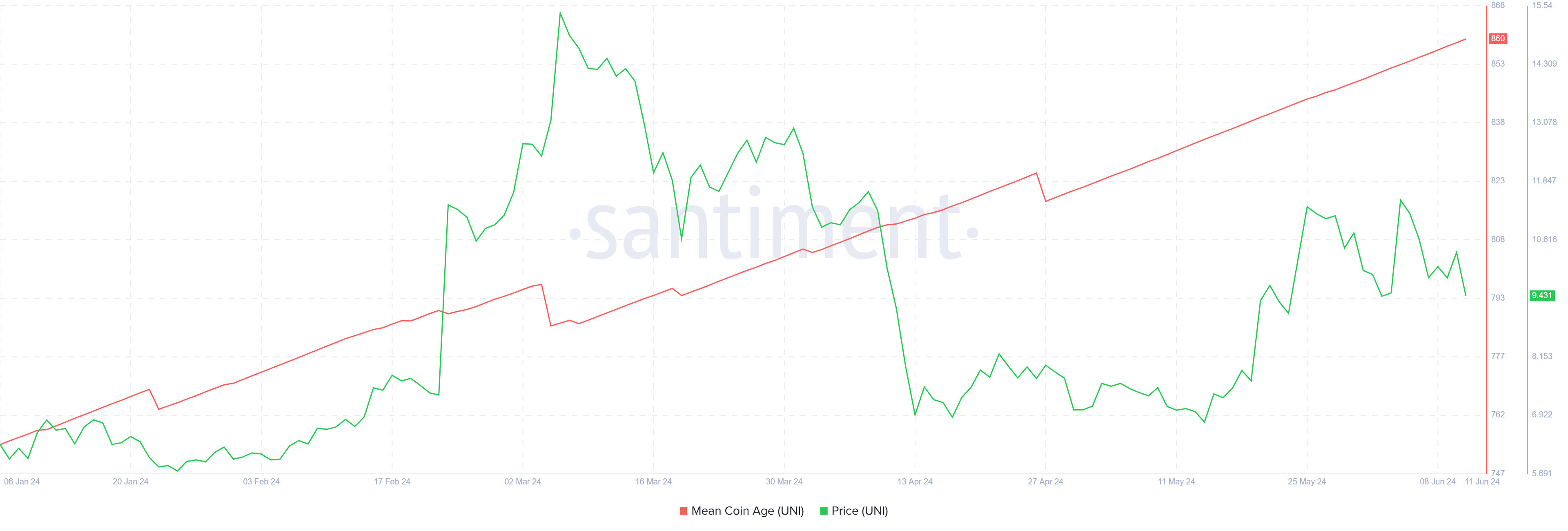 Adapun kenaikan yang terus-menerus pada indikator ini menunjukkan bahwa sentimen di kalangan holder UNI adalah sentimen HODL. Sebaliknya, turunnya nilai MCA mengindikasikan bahwa aksi jual mulai mendominasi.