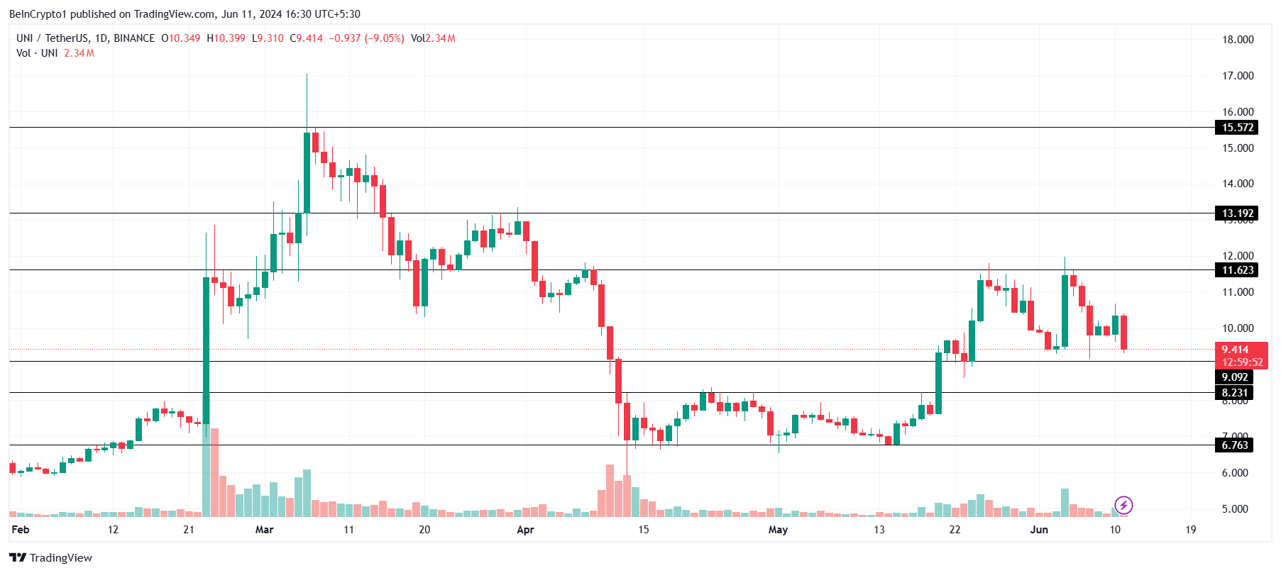 Harga Uniswap turun lebih dari 9% dalam 24 jam terakhir, menyebabkan altcoin ini diperdagangkan seharga US$9,4. Walhasil, UNI kehilangan level support US$10,0 dan nampaknya akan menguji zona US$9,0 sebagai level support krusial berikutnya.