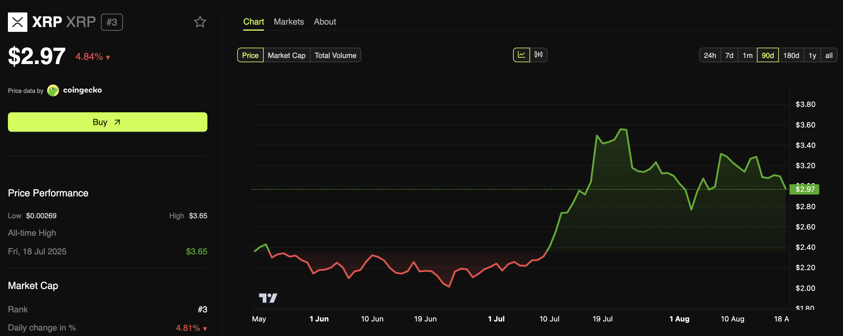 Prediksi optimistis ini muncul saat XRP turun di bawah US$3 hari ini. Penurunan ini adalah bagian dari kemerosotan pasar yang lebih luas yang membuat semua dari sepuluh koin teratas berada di zona merah.