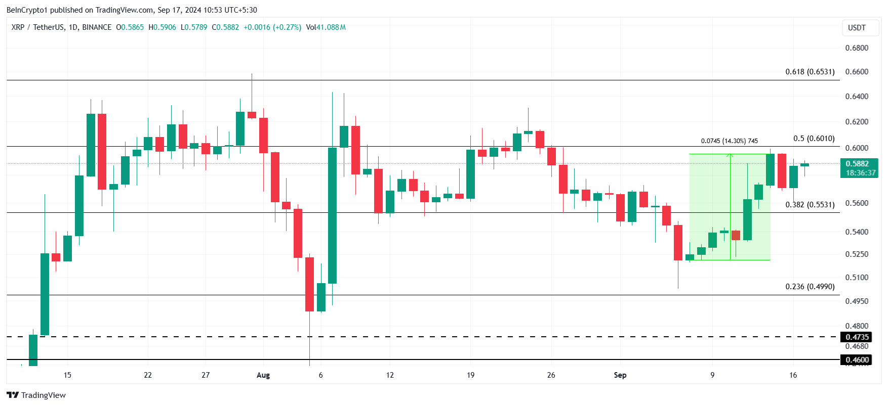 Harga XRP telah berjuang untuk bertahan di level kunci US$0,60, bertepatan dengan garis Retracement Fibonacci 50%. Meskipun terus mencoba menggapai titik tersebut, altcoin ini secara konsisten gagal menembus level resistance yang ada.