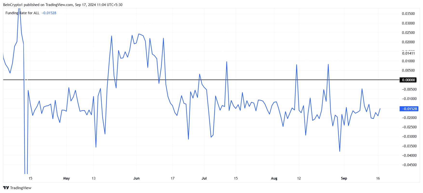 Hanya empat kejadian yang melihat funding rate berubah positif, dan menunjukkan bahwa sebagian besar trader telah mengantisipasi adanya penurunan harga. Saat ini, XRP mengalami sentimen negatif serupa, yang mencerminkan ekspektasi trader akan penurunan yang berkelanjutan.