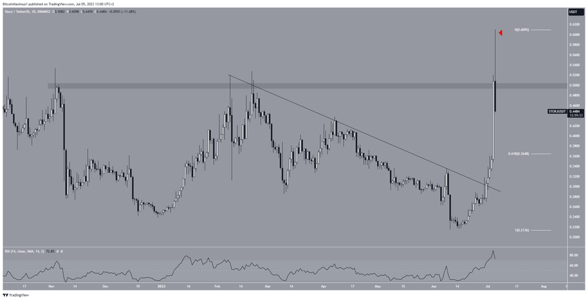 Kemudian, harga STORJ berhasil breakout dari garis descending resistance pada 18 Juni. Pada saat itu, garis tersebut sudah bertahan selama 581 hari. Meskipun harganya mencapai titik tertinggi tahunan baru di US$0,61, STORJ sedang dalam proses membentuk sumbu atas (upper wick) yang panjang (ikon merah). Lebih lanjut, harganya berisiko jatuh di bawah area horizontal US$0,48.