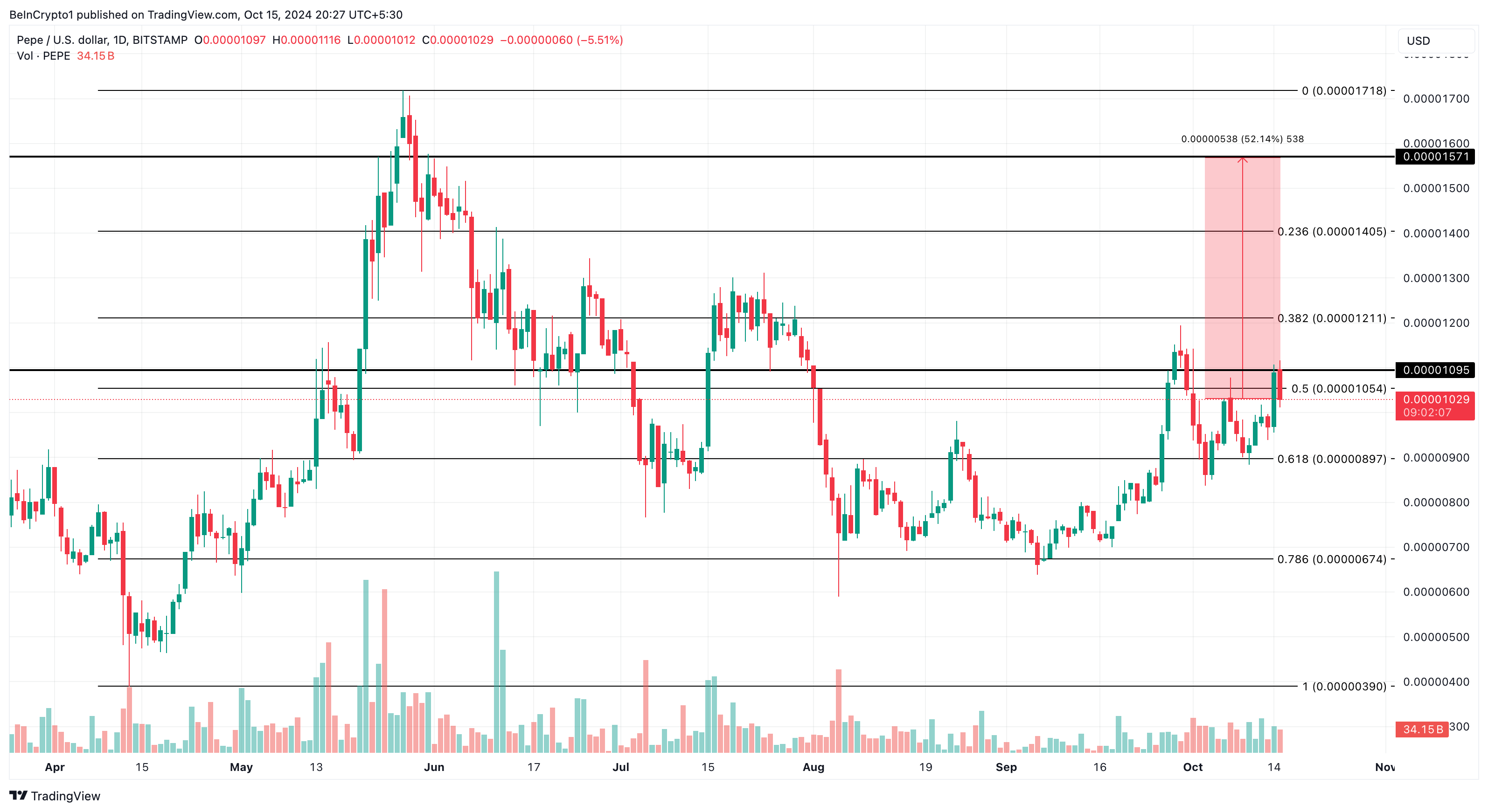 Bila kita mencermati grafik harian, terlihat bahwa PEPE mencoba naik ke atas US$0,000011 tetapi menghadapi penolakan, alhasil menyeret harga turun. Namun, grafik menunjukkan bahwa tren naik mungkin belum usai.