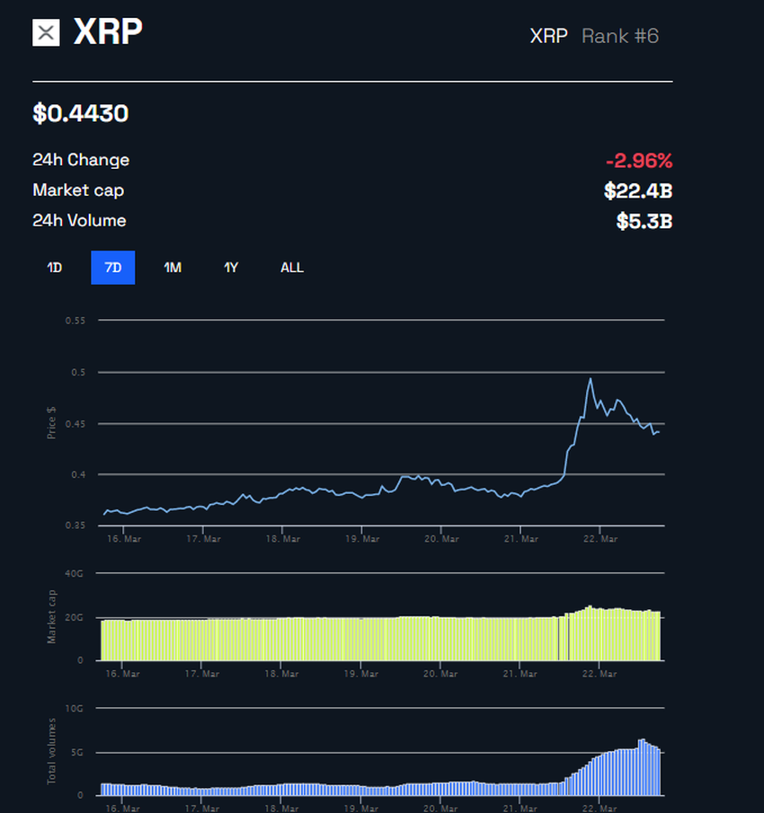 Harga XRP sontak melambung menjadi US$0,45 pada pukul 08.00 Eastern Time sesaat setelah Presiden Ripple Labs memperkirakan bahwa Ripple akan memenangkan kasusnya melawan Komisi Sekuritas dan Bursa (SEC) AS.
