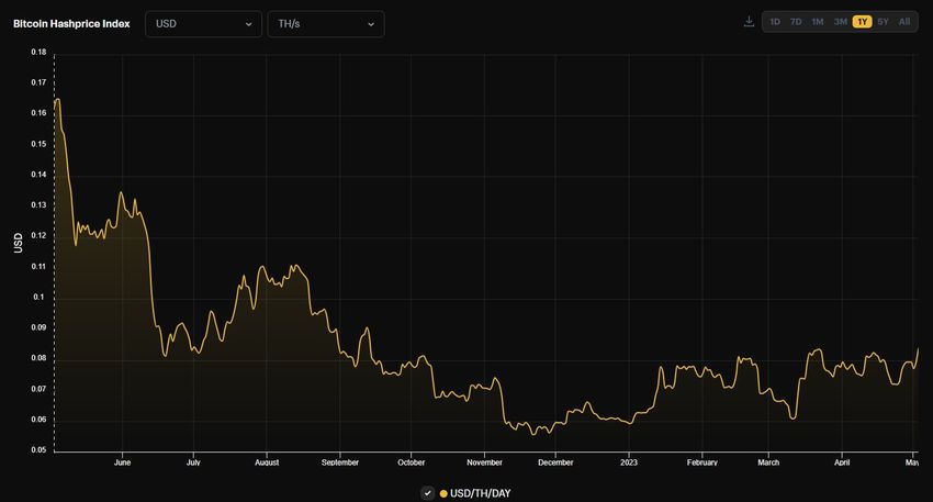 Hash price saat ini, yang dihitung dalam dolar per terahash per detik per hari, adalah sebesar US$0,083 per tanggal 2 Mei. Kabar baiknya, hash price ini sekarang sedang naik dan tercatat sudah naik 50% sejak mencapai titik terendah US$0,055 pada November 2022.